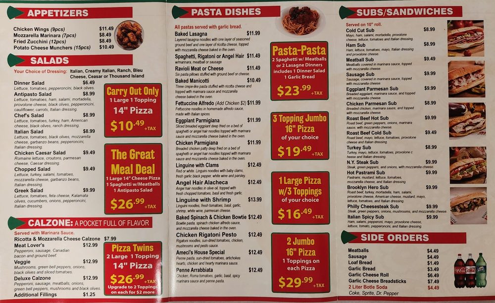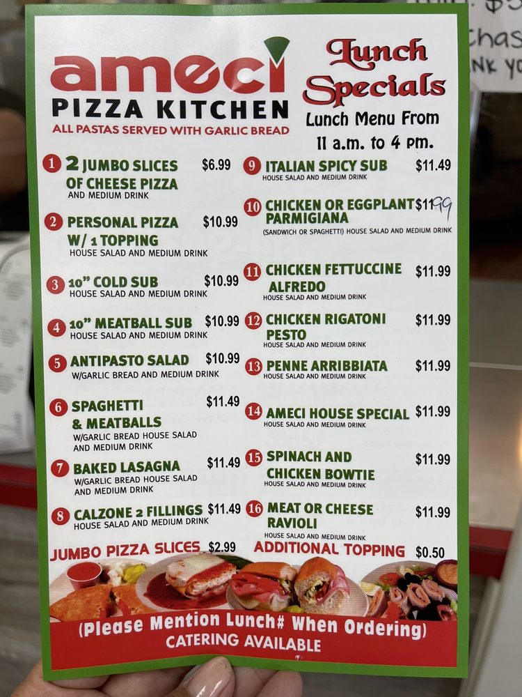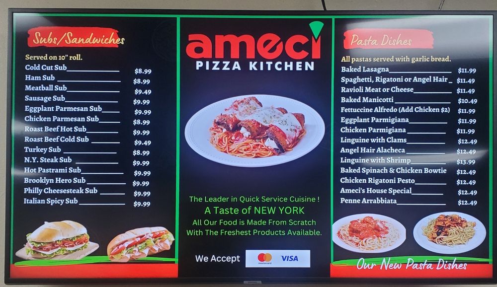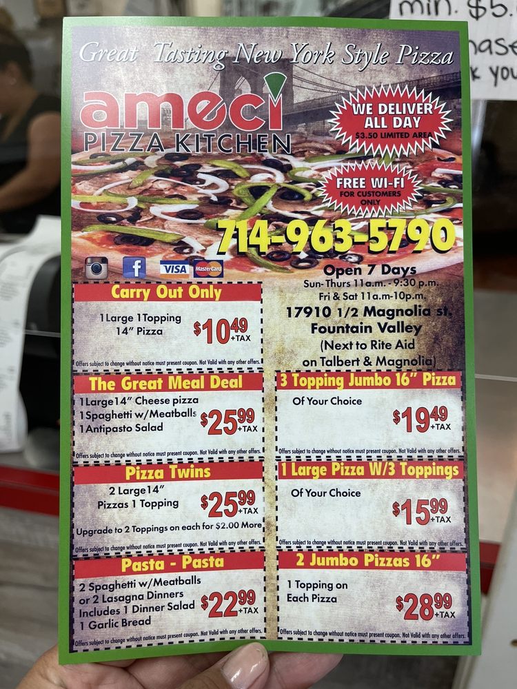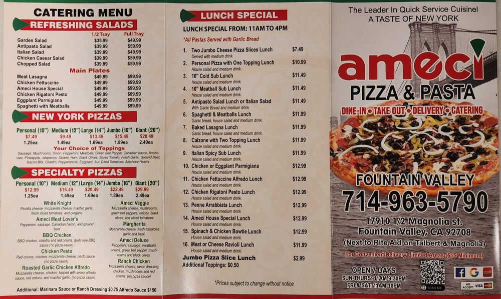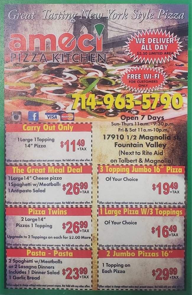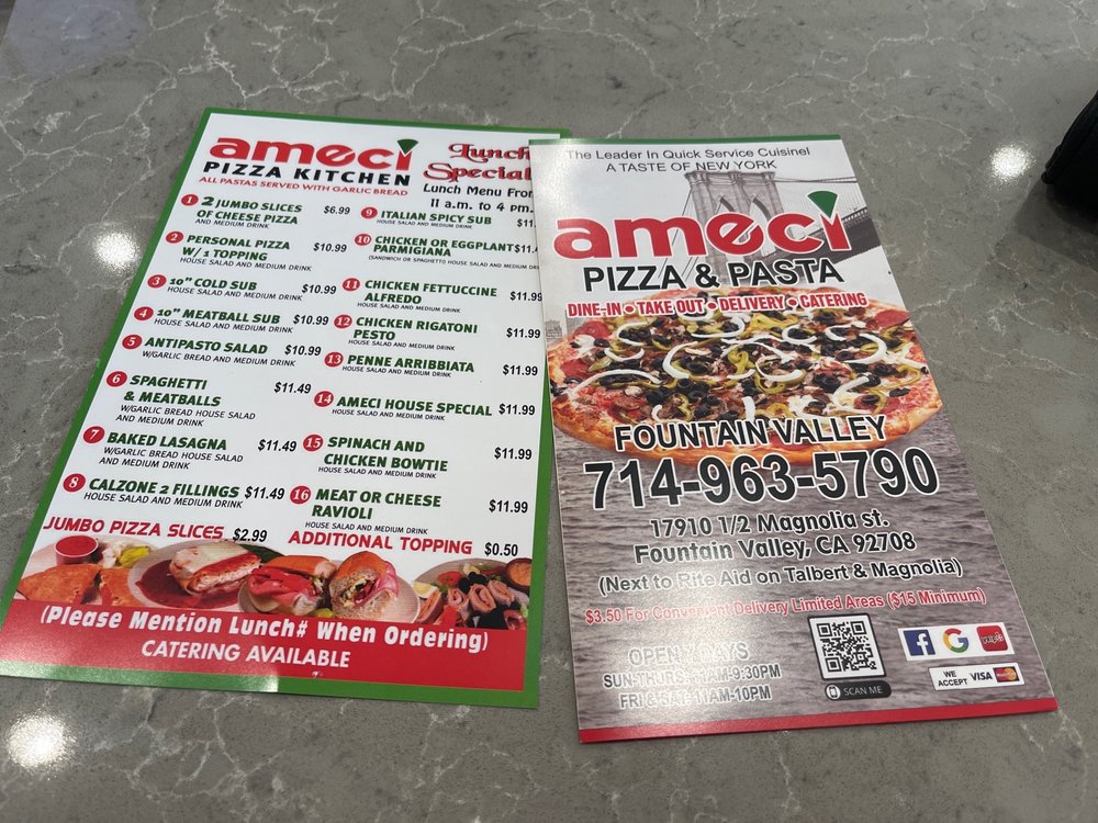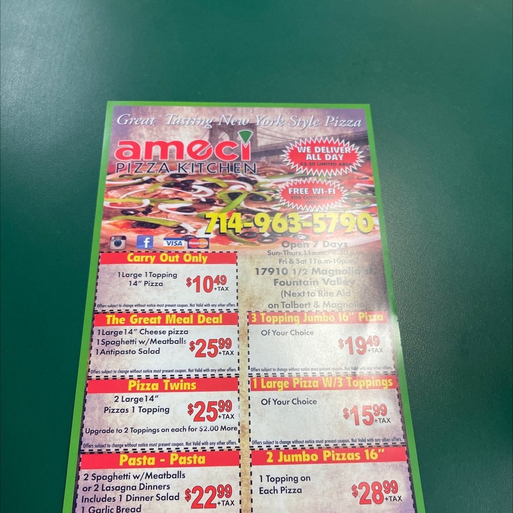 Ameci Pizza Kitchen is a casual dining spot in Fountain Valley, CA, offering a variety of delicious options. From appetizers like Chicken Wings and Fried Zucchini to salads like Antipasto and Chef's Salad, the menu caters to a range of preferences. Their Subs and Sandwiches, like the Meatball Sub and Eggplant Parmesan Sub, are also popular choices. Customers have praised the quality of food, with standout dishes like the artichoke and pineapple pizza and BBQ chicken wings receiving high praise. The friendly service and reasonable prices make it a go-to spot for many. With a focus on fresh ingredients and generous portions, Ameci Pizza Kitchen is a hidden gem worth trying.